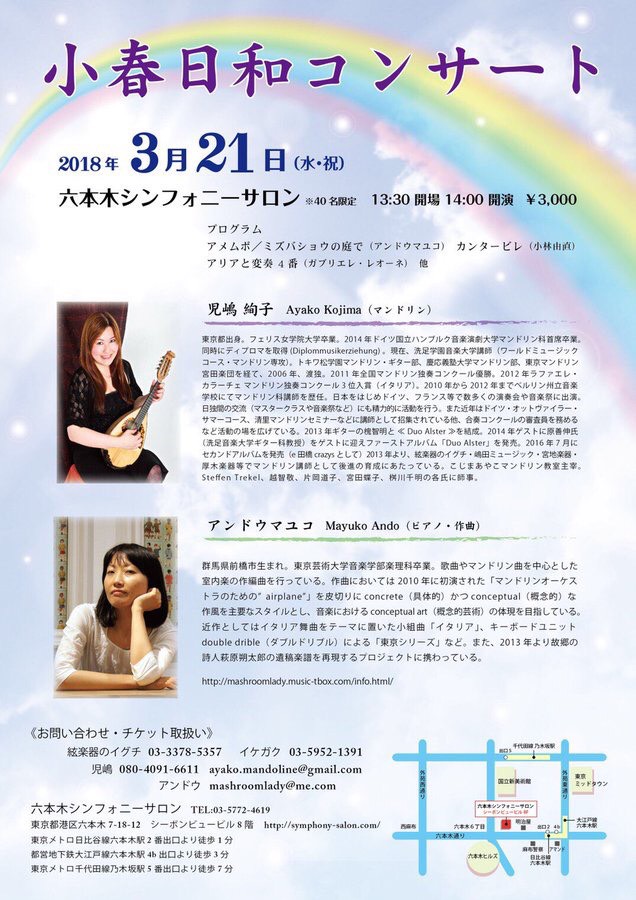 出演 :茂木 真由美(ソプラノ)、田口 友里(メゾソプラノ)、齋藤 菜緒(ピアノ)